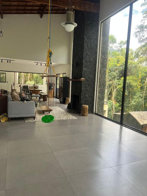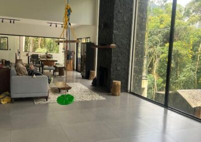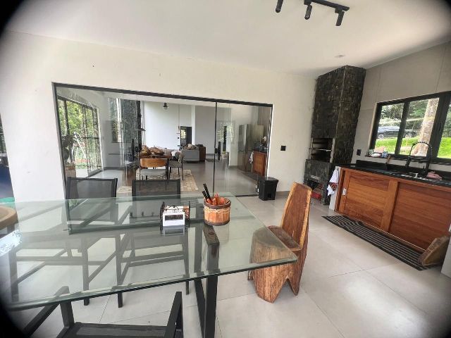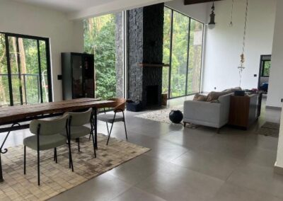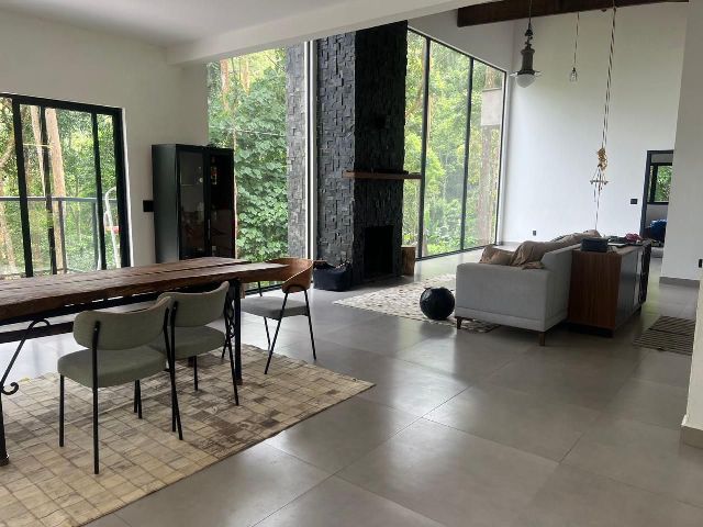 . Sala ampla e integrada, com parede de vidro e lareira.